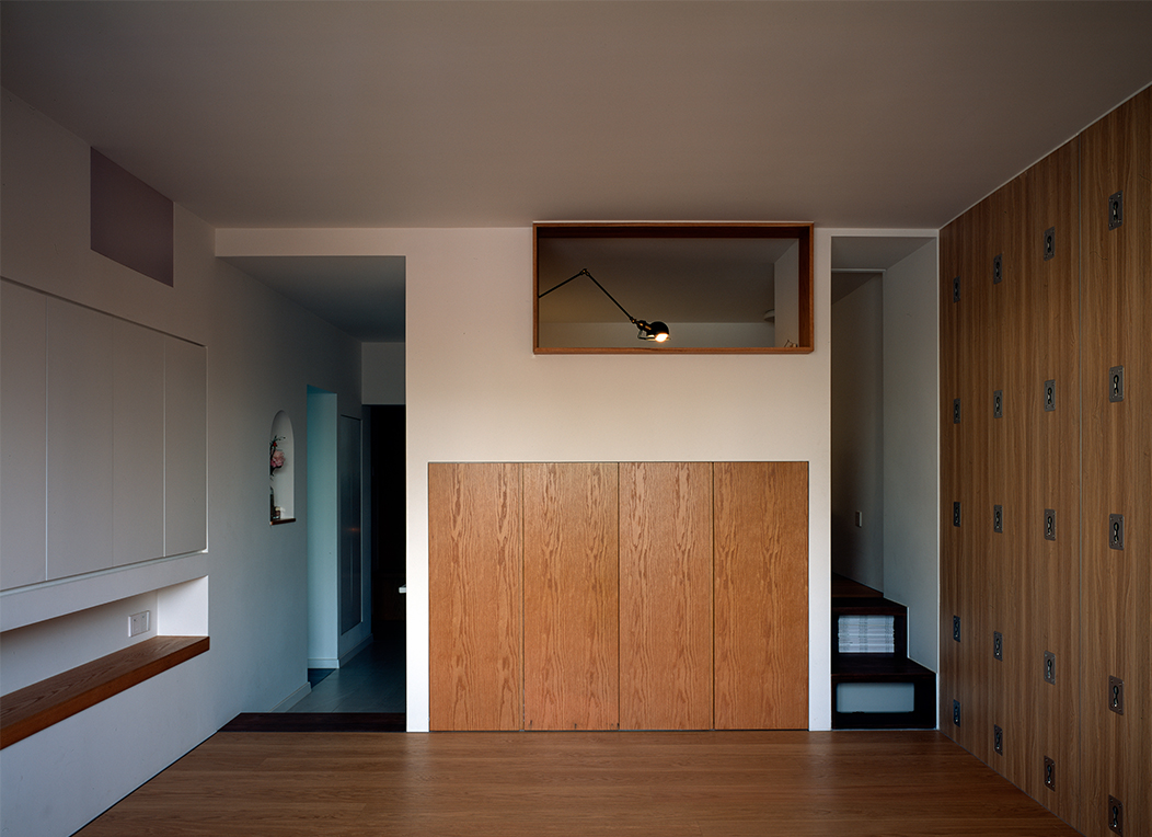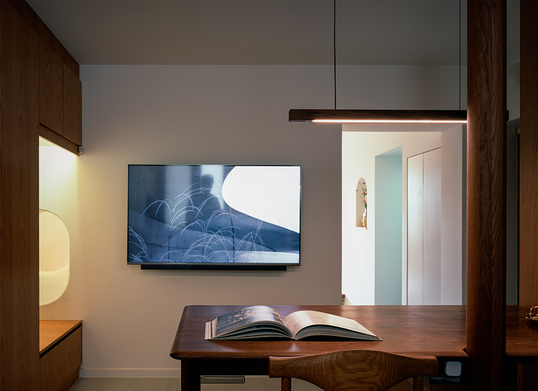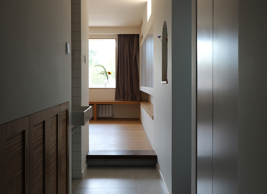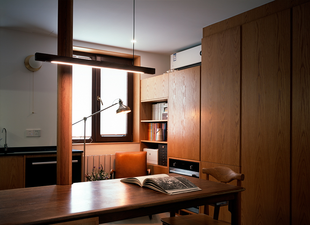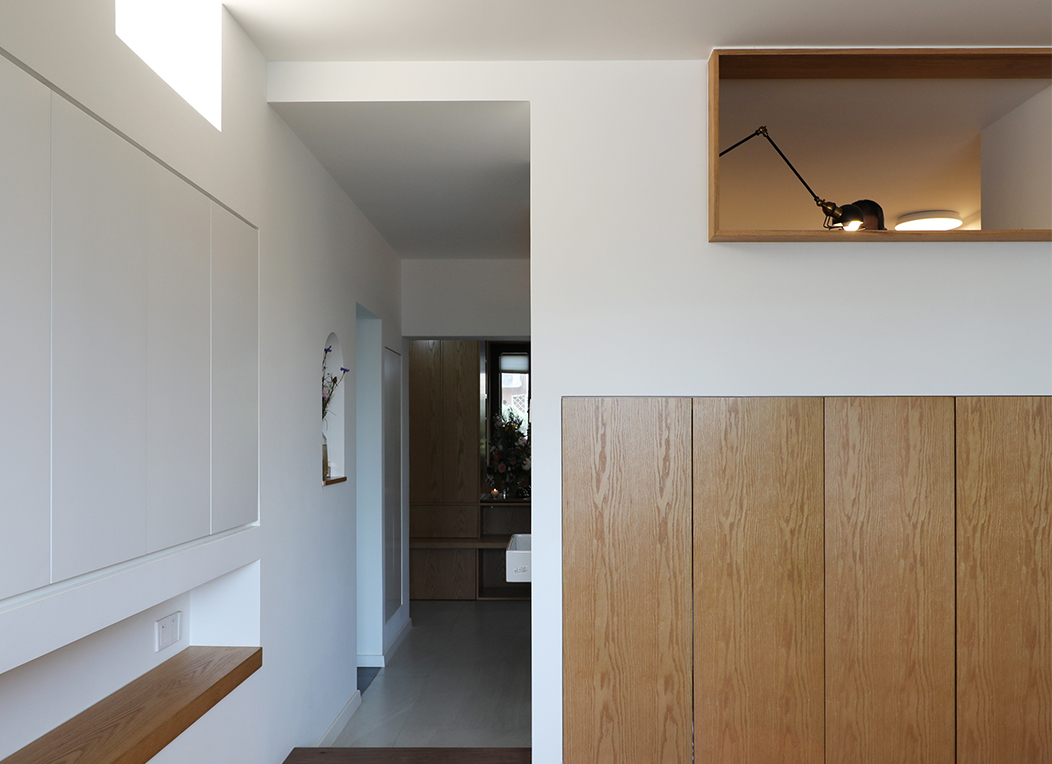 起居室和厨房合并,女儿房和书房合并,主卧跟瑜伽房合并,然后把阳台变成一个榻榻米茶室,从北到南一字排开。中部采光较差的部分抬高,向主卧探出一个大大的不透明窗用来采光,辅以人工照明,创造一个独特的“深处”,女儿房开一个“兔子洞”。没有真正的客厅,入口的大桌子就成了家庭生活的核心,跟一部分橱柜和入口玄关柜整合起来,是个三位一体的大家具的一部分,煤气管道用一根空心木柱包起来。房子是一长条,中部置入“大家具”,两侧两个出入口,剖面上形成了一次起伏。人在这条路径中行走,上去再下来,像爬一座小山,故名“小山宅”。