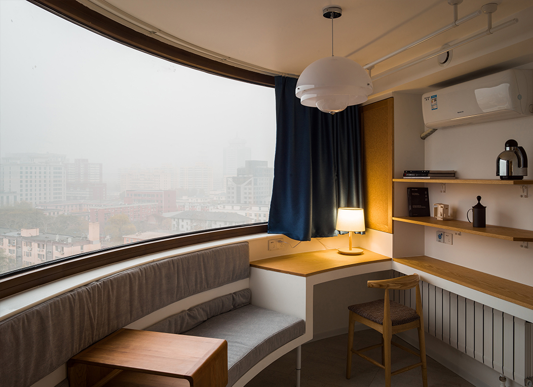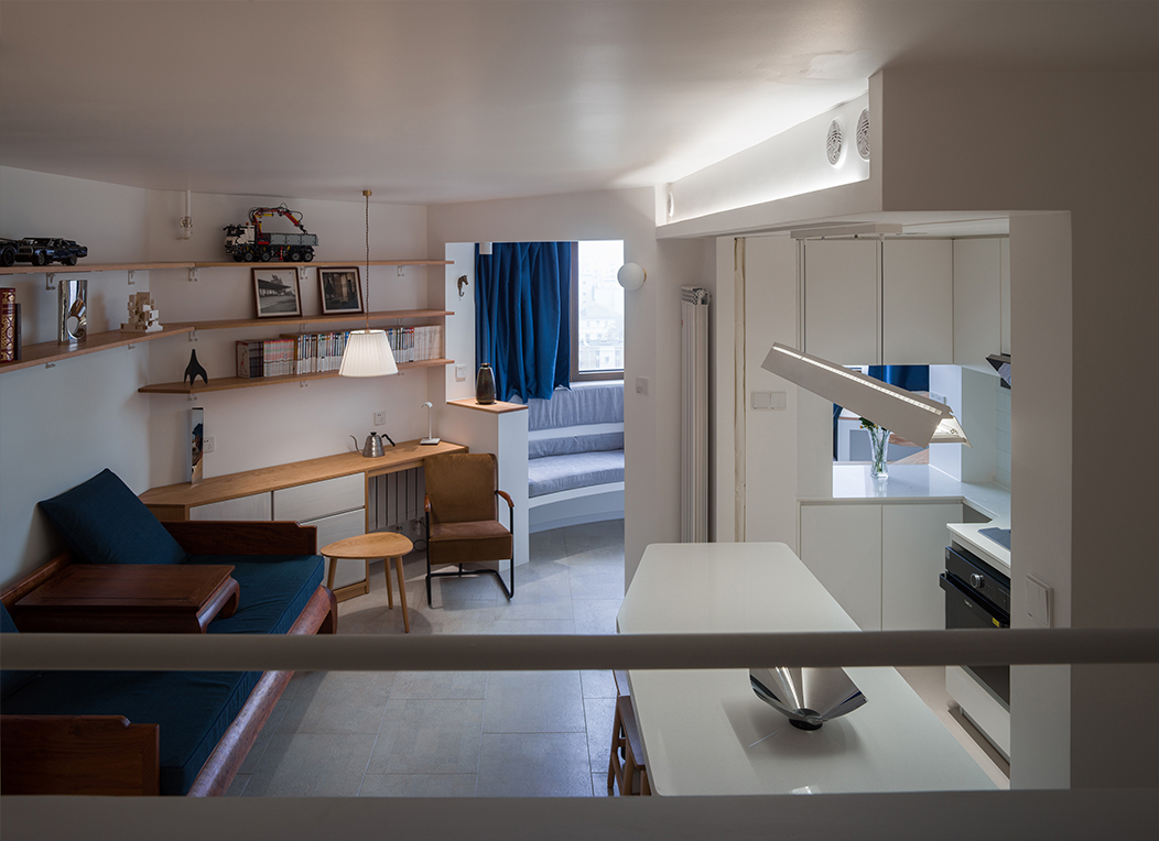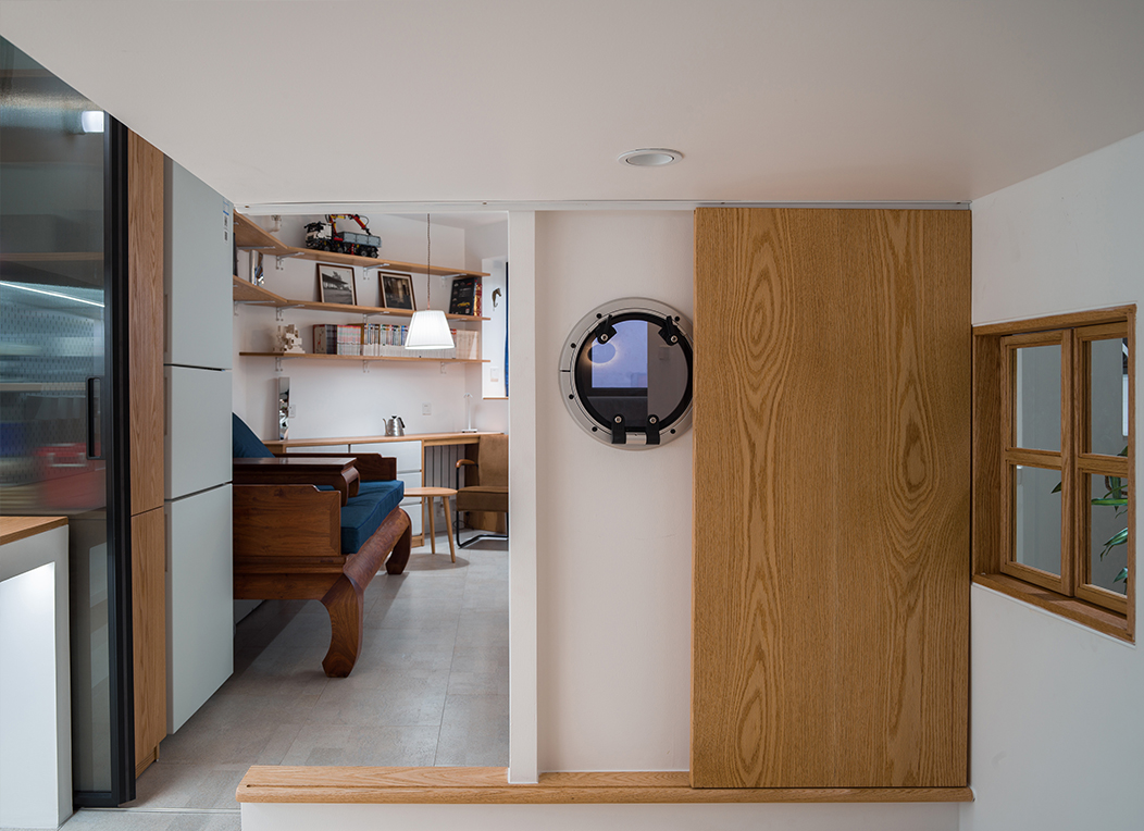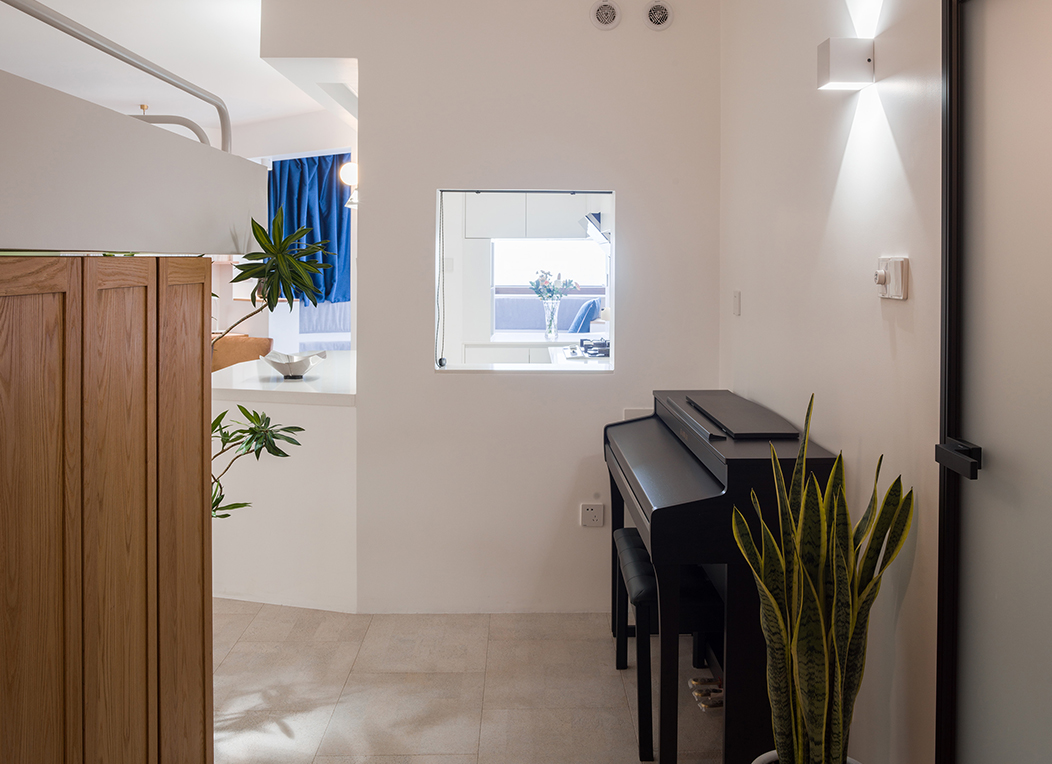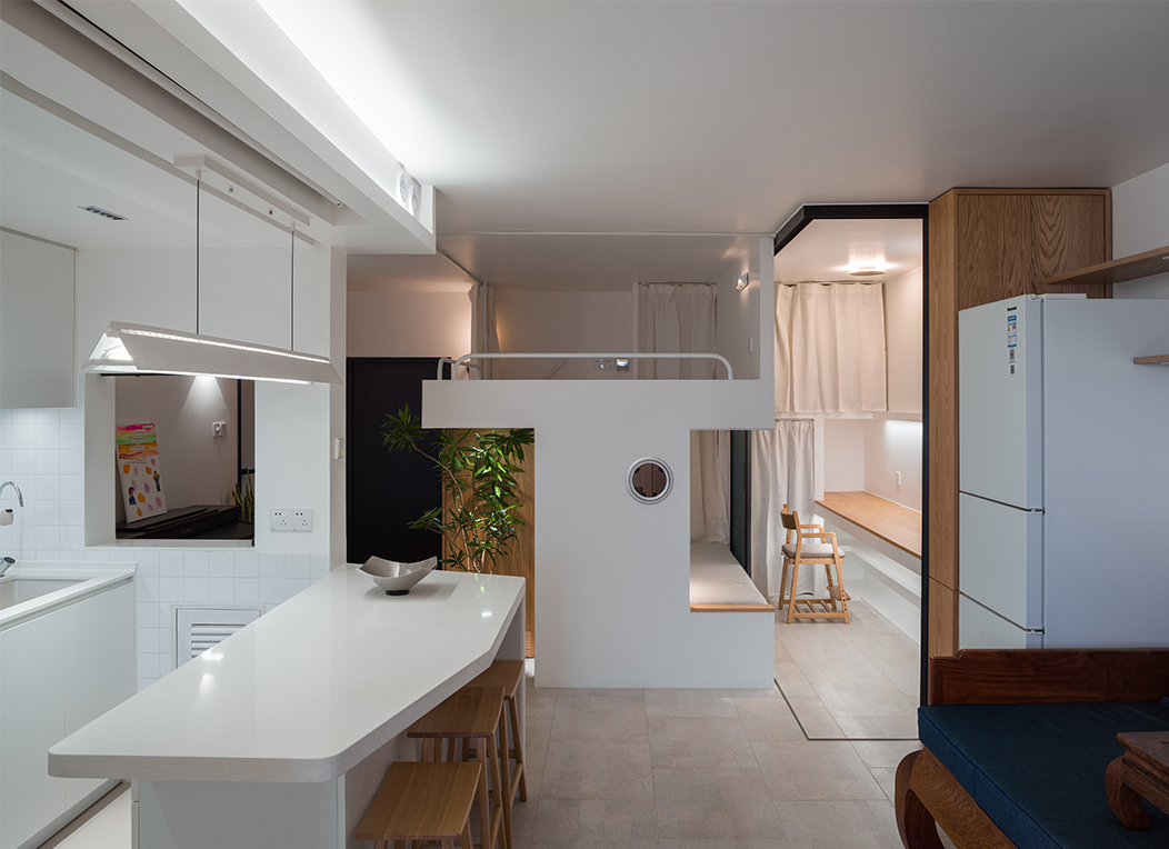 这个设计中需要在有限的空间里解决光与空气这些基本的物理要素之余,将业主对于“家”不断堆砌的爱意和浪漫想象进行规整。寝、食两大功能分别被设计成了两块集约的装置体,呈对角线。余下两道空处留给玄关与客厅,清晰地将主屋分成四个部分。位于第二象限的床体,是全屋最重要的置入式大家具,最终采用了水手式剖面。大床装置余下的空间,成为第三象限,为我们自然留出了一处玄关,这里也是一处重要的交通核心枢纽,设置了一道最丰富且最远的视界。整个屋子右半边为家庭公共生活服务。厨房位于第四象限,给此处配置了首领视角。第一象限客厅主位上,保留了业主曾经的花梨罗汉床。中岛,作为吃与看的交汇处,成为起居的核心。
