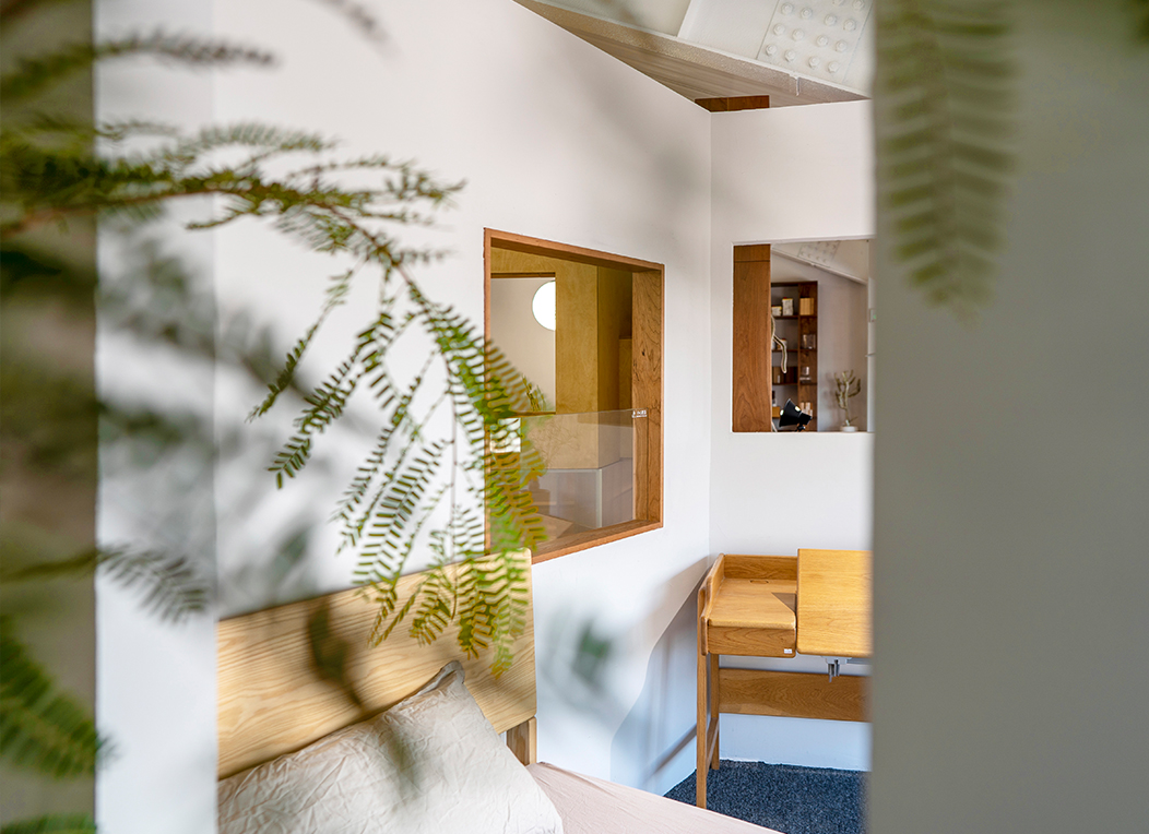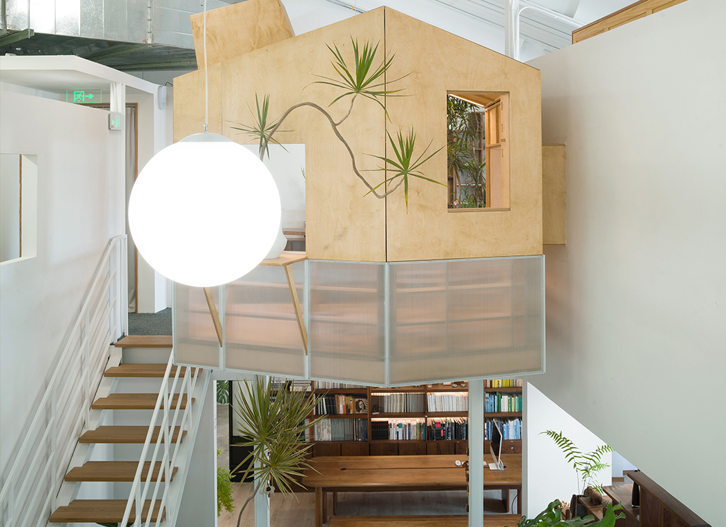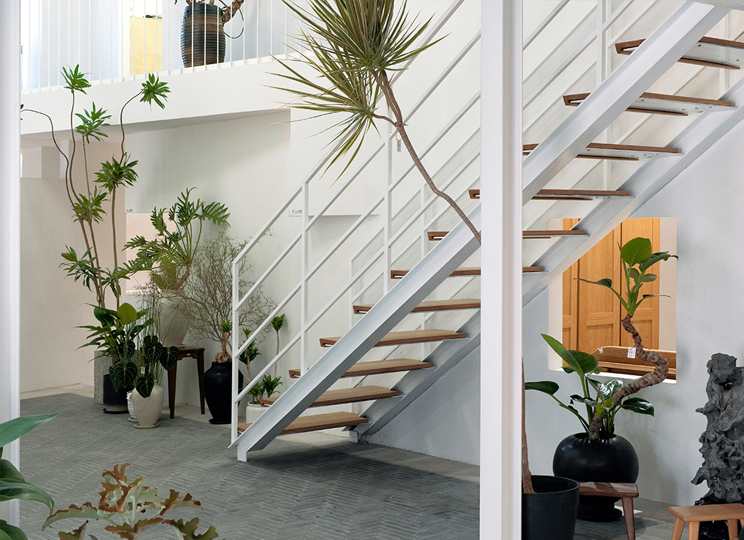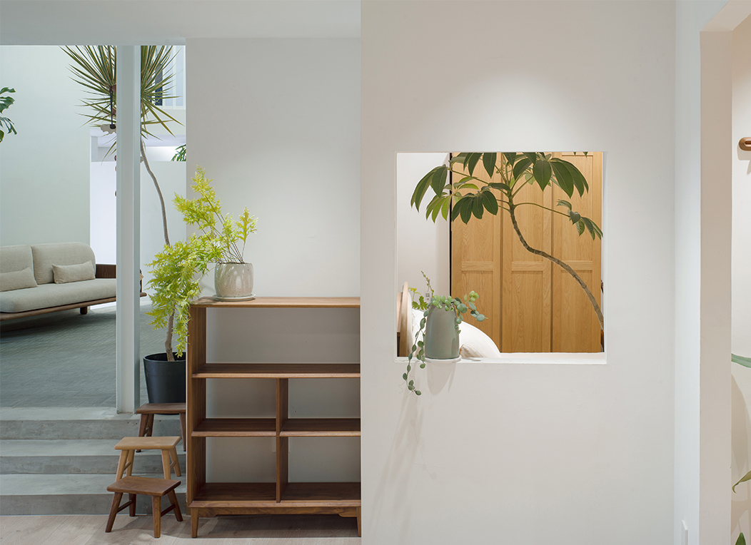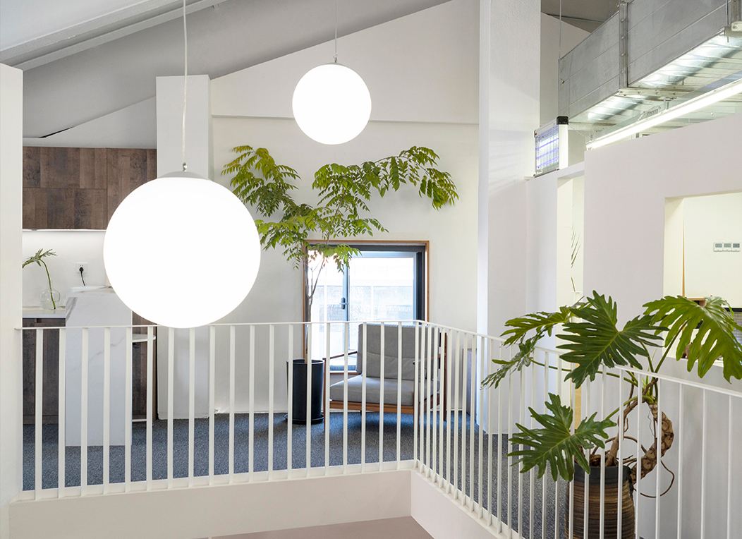 家具展区沿周边布置,中部空出,利用屋脊7m的高度成为一个垂直的“内庭院”,用素抹灰墙壁来区隔空间、划分领域,再在墙上开方形洞口,建立视线关联、增加层次。这样就可以实现一种内部的虚实对比。“庭院”地坪比周边展厅高,中央采用小青砖铺地,与周围白墙一起烘托室外感。屋顶悬下四个不同高度的球灯,给中庭提供照明,展厅的主入口创造出一种曲折山路到达山腰客馆的体验。植物在这个“工作花园”中用自然形式柔化了几何形体的刚硬,为空间赋予了生机。轻型钢结构统一做刷白处理,保持视觉上的轻盈和整洁。